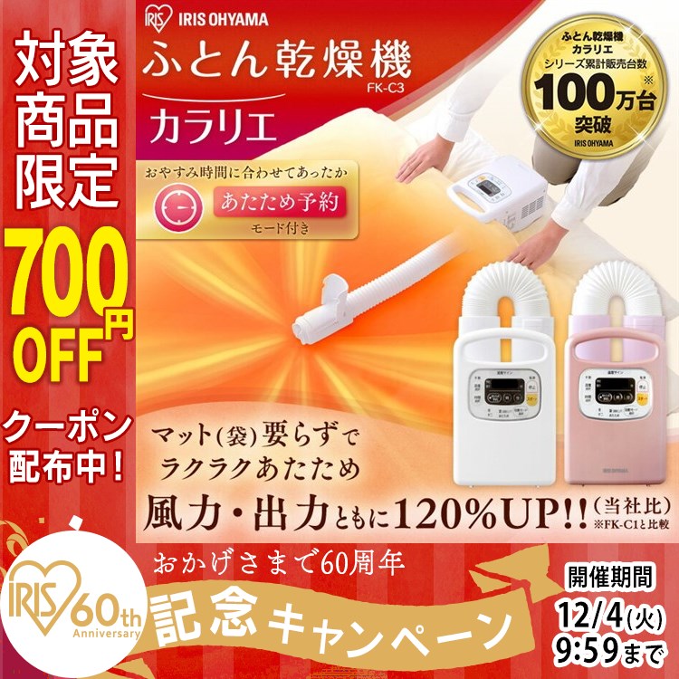 ![]() 価格: 13,824円 レビュー評価:0.0 レビュー数:0 コンパクトなのにパワフル!「ふとん乾燥機 カラリエ」は累計販売台数 100万台を突破しました!※ふとん乾燥機カラリエシリーズにおける2015年2月?2017年12月の累計販売台数。 アイリスオーヤマ調べ。温風でふとんをあたため、湿気をカラッと飛ばしてくれる「ふとん乾燥機カラリエ」冬でもあったかいふとんで寝たい!ふとんの湿気やダニが気になる!外でふとんが干せない! そんな方にオススメです。◆ダブルサイズのふとん対応これまでのふとん乾燥機(FK-C1)より風量・出力ともに120%パワーアップしました。ダブルサイズのふとんにも対応できます。◆簡単セッティングホースを伸ばして、ふとんをかぶせてボタンを押すだけでふかふかのあったかふとんが完成します。◆コンパクト&軽量コンパクト&約1.8kgの軽量設計。持ち運びラクラク。収納も省スペースで済みます。◆「あたため予約」設定した時刻の30分前からあたため (更新日時:2018/12/04 09:55) Supported by 楽天ウェブサービス |